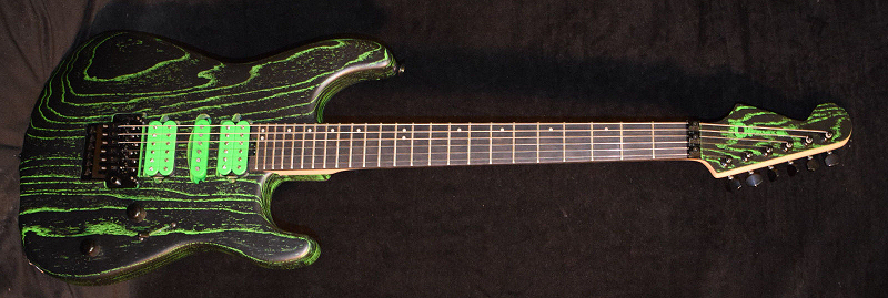 10448 | San Dimas | Sandblasted Satin Black with Neon Green Filler | ebony | Rev. Strathead | HSH | Floyd Rose | 2017 Winter Namm | ||