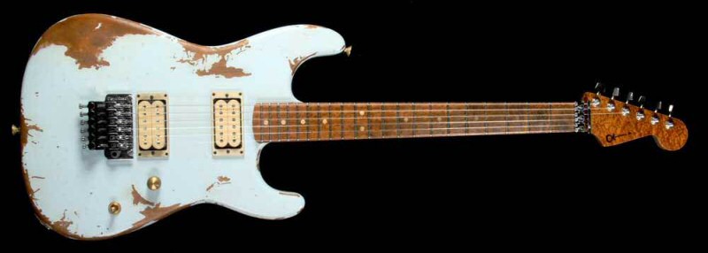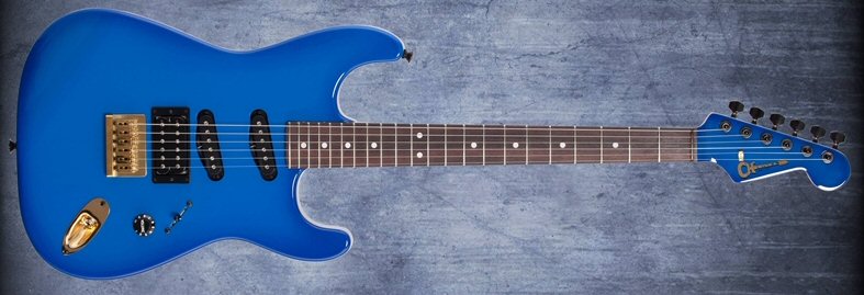 | 10760 | San Dimas | Blue Sparkle | b/e maple | Strathead | 2H | Floyd Rose | 21 frets | ||