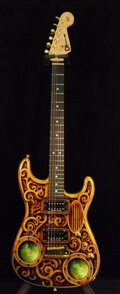 | 9233 | San Dimas | Ernie Pedregon Graphic | curly maple | Strathead | 2H | NOS brass v-trem | |||